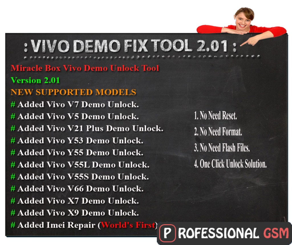 Miracle Box VIVO Demo Fix Tool 2.01 Released Qualcomm | MTK [26 NOV 2017] VIVO Demo Fix Tool 2.01 Qualcomm | MTK New Update! Added Vivo V7 Demo Unlock. Added Vivo V5 Demo Unlock. Added Vivo V21 Plus Demo Unlock. Added Vivo Y53 Demo Unlock. Added Vivo Y55 Demo Unlock. Added Vivo Y55L Demo Unlock. Added Vivo Y55S Demo Unlock. Added Vivo V66 Demo Unlock. Added Vivo X7 Demo Unlock. Added Vivo X9 Demo Unlock. Added IMEI Repair QCN Mode (World’s First).